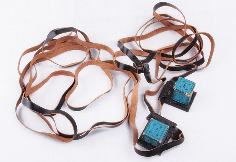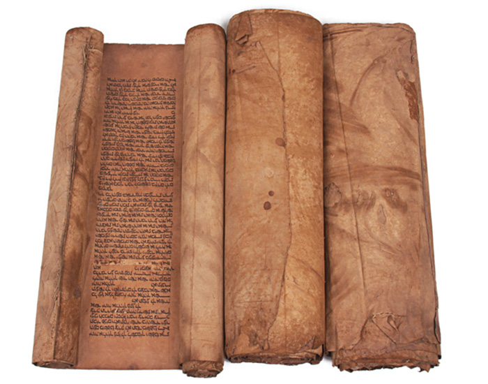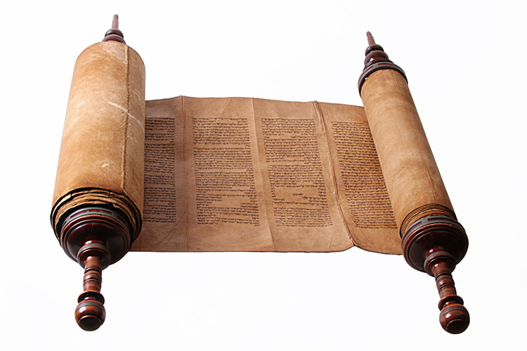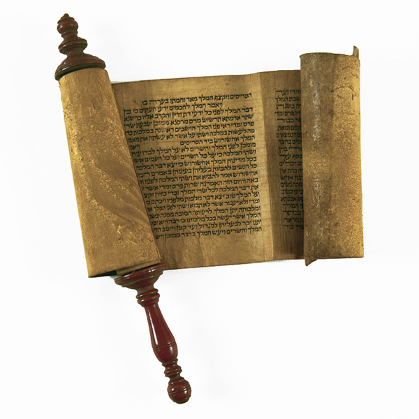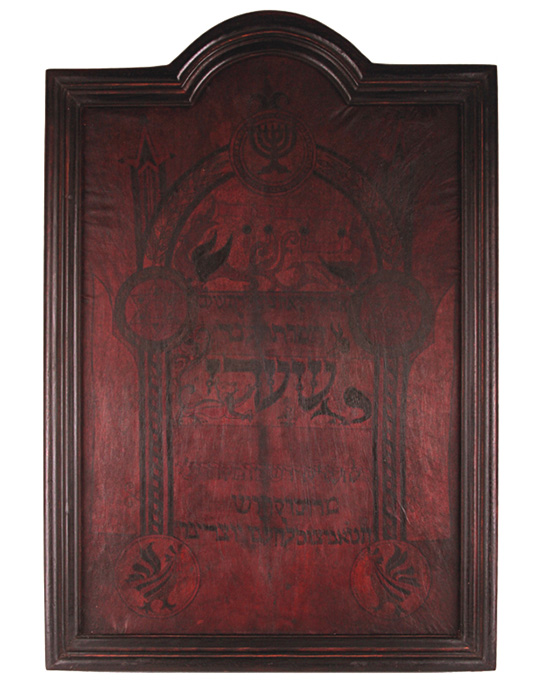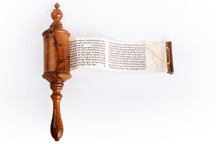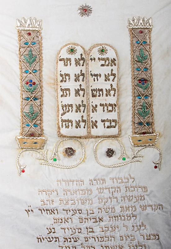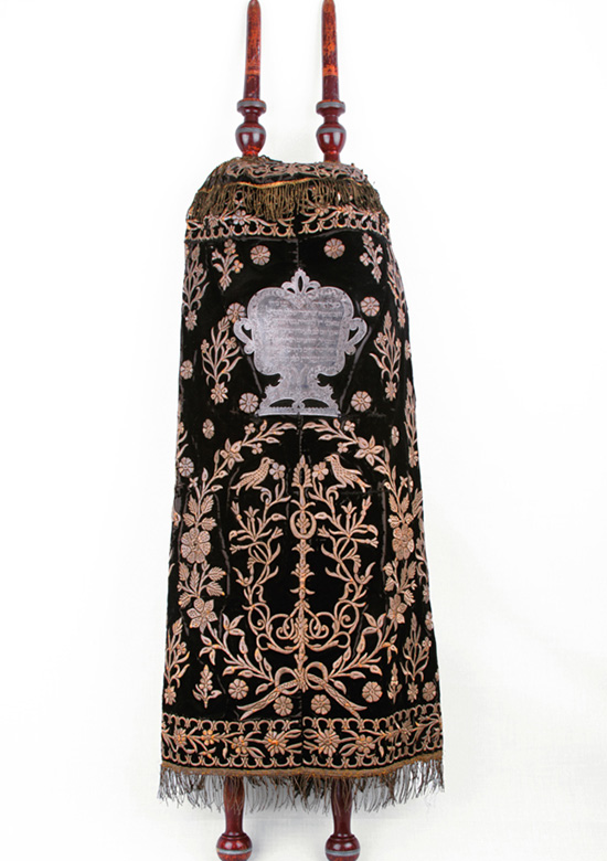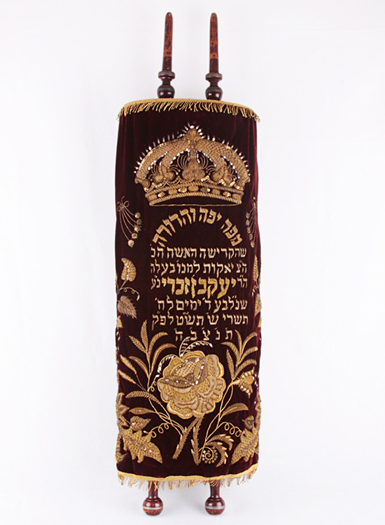 Papel impreso en hebreo, soportes cilíndricos de madera y mapá (cobertor) de terciopelos con bordados de hilos dorados