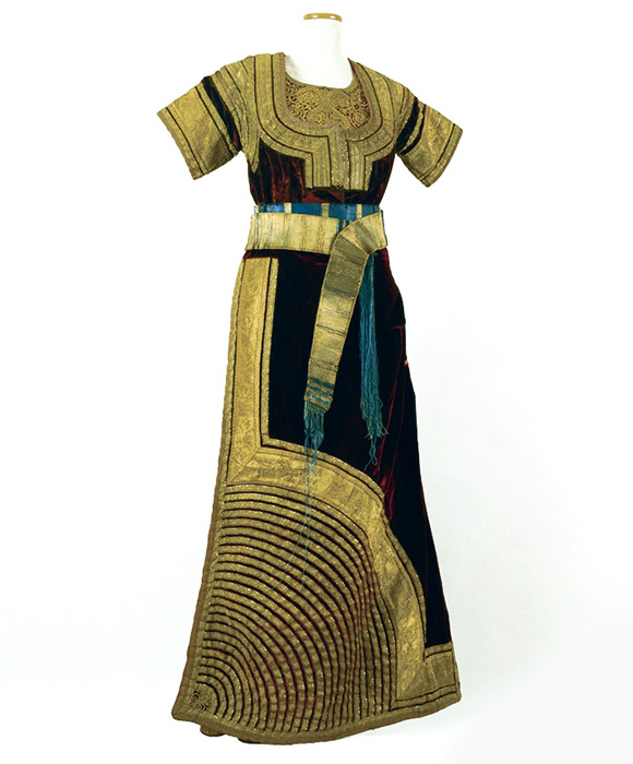 Terciopelo marrón bordado con hilos dorados, aplicaciones de lazos dorados y lentejuelas