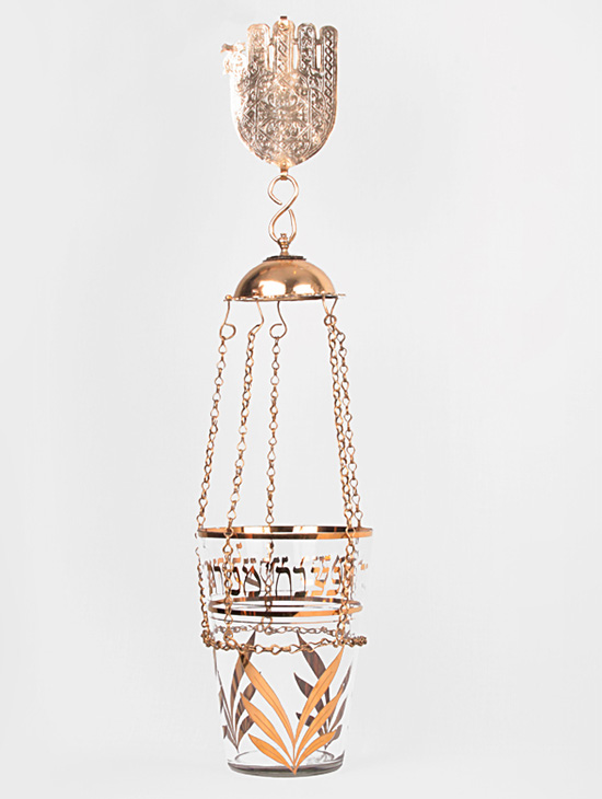Vaso de cristal con inscripciones doradas en hebreo: "Lámpara para encender en memoria de las almas de los fallecidos. Sea su alma recordada pra siempre"