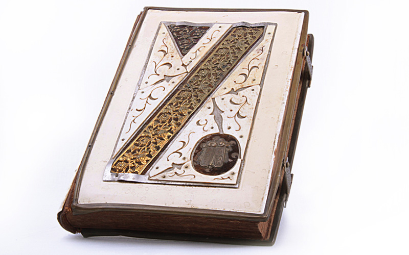 Libro con cubierta de hueso e incrustaciones de bronce, impreso en hebreo