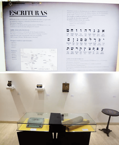 La muestra ofrece asimismo un panel didáctico que da información básica sobre el idioma hebreo.