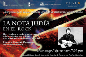 El domingo 3 de junio el director del departamento de cultura de la Unión Israelita de Caracas, Emanuel Abramovits, dictó una charla sobre la influencia de dos minorías, la judía y la afroamericana, en el rock. La presentación se hizo en la sede del Museo Sefardí de Caracas (Asociación Israelita de Venezuela) a las 11:00 am.